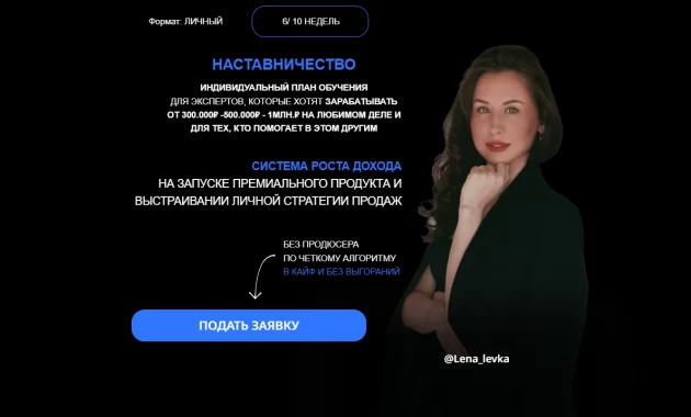 Индивидуальный план обучения для экспертов, которые хотят зарабатывать от 300.000₽ -500.000₽ - 1МЛН.₽ на любимом деле и для тех, кто помогает в этом другим. Система роста дохода на запуске премиального продукта и выстраивании личной стратегии продаж. Без продюсера, по четкому алгоритму в кайф и без выгораний.